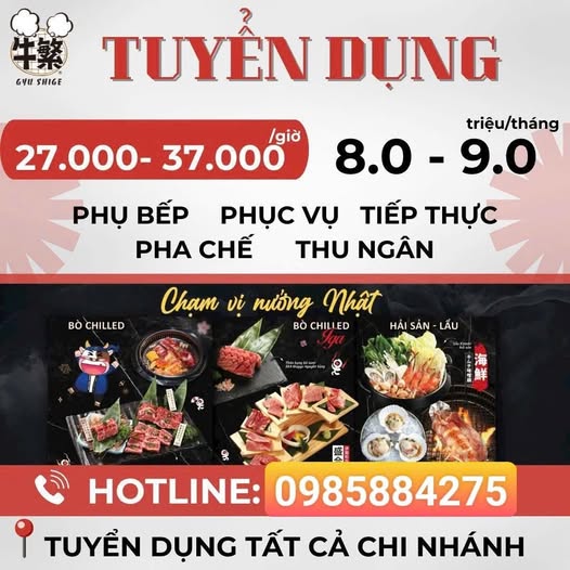 GYU SHIGE TUYỂN THÀNH VIÊN MỚI Địa điểm: Các chi nhánh tại TP.HCM Vị trí: Phụ bếp | Phục vụ | Tiếp thực | Pha chế | Thu ngân Thu nhập: – Part-time: 27.000 – 37.000đ/giờ – Full-time: 8 – 9 triệu/tháng Có phụ cấp, tips, thưởng, lễ tết x3 Thời gian làm việc linh…