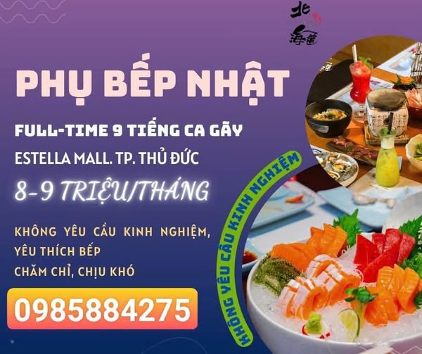 Phụ bếp là bước đầu – chinh phục ẩm thực từ trái tim! Nhà hàng Sushi Hokkaido Sachi – chi nhánh Estella Mall, Quận 2 (TP. Thủ Đức) đang tìm PHỤ BẾP NHẬT gia nhập đội ngũ! Full-time ca gãy: Nghỉ giữa ca 2–3 tiếng để thoải mái nạp lại năng lượng Quyền lợi: Lương…