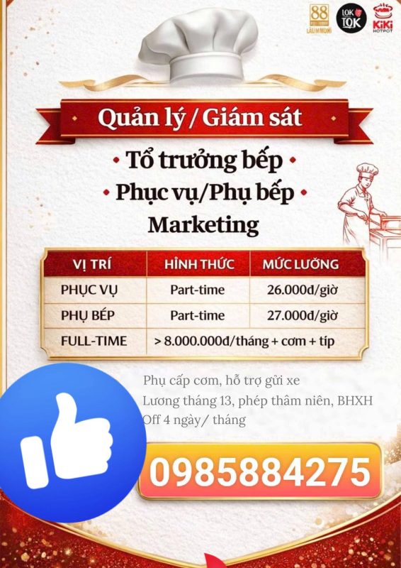 Đi làm ngay – Thu nhập ổn định – Môi trường chuyên nghiệp VỊ TRÍ TUYỂN DỤNG • Quản lý / Giám sát • Tổ trưởng bếp • Phục vụ / Phụ bếp • Marketing THU NHẬP HẤP DẪN • Phục vụ (Part-time): 26.000đ/giờ • Phụ bếp (Part-time): 27.000đ/giờ • Full-time: > 8.000.000đ/tháng + cơm…