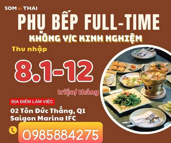NHÀ HÀNG THÁI – SOMTUMTHAI TUYỂN DỤNG PHỤ BẾP Làm việc tại: 29 Lê Thánh Tôn, Quận 1 Thu nhập khởi điểm: 8.000.000 – 9.000.000 VNĐ/tháng Thời gian làm việc: – Ca sáng: 09h00 – 15h00 – Ca tối: 17h00 – 23h30 – Ca Full-time: 09 tiếng/ngày (Ca gãy) Nghỉ 1 ngày/tuần Quyền lợi: -Tăng…